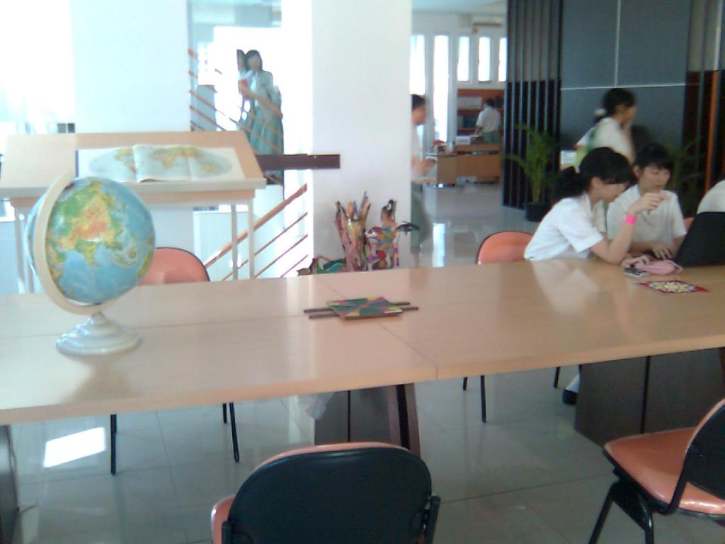 Pertama-pertama pas masuk ada scanner gitu (kayak di toko-toko di pintu masuk yang bunyi kalau ada yang ketauan nyolong)…NAH! kalau misalnya ada anak yang ga meminjam buku dengan prosedur alias menyelipkan buku itu ke dalam tasnya, wah pas keluar bunyi deh tit tit tit tit..,haha. Tapi belum ada sih yang secara sengaja. Palingan kebawa secara sengaja karena buru-buru udah dijemput, haha. Terus pas masuk kita harus ngescan barcode yang ada di kartu pelajar kita di komputer absensi. Kalau barcodenya udah kescan tertera deh nama, alamat, nomor induk, bla bla bla. Terus udah deh kita bisa ke perpusnya. Perpustakaan kita lantainya ada 4. Lantai 1 itu semacam lounge lah. Isinya sofa-sofa banyak banget sama koran hari ini, dan majalah-majalah terbaru, dan tabloid, dan jurnal terbaru. Kayaknya kita langganan banyak majalah gitu deh, soalnya ada Nat.Geo, Reader’s Digest, Kartini, Gadis, Hai, Bola, Info Komputer, Gatra, Tempo, bahkan waktu itu gw baca2 majalah Elle, Harper’s Bazaar, dan masih banyak lagi.. Buku-buku juga diperbaharui terus… Jadi di lantai satu deket tangga kayak ada Buku-buku baru yang dipajang. Emang itu kusus tempat buku baru, jadi emang persis kayak buku baru yang di toko buku. Juga ada semacam panggung pendek kayu gitu dengan bantal-bantal besar untuk anak-anak yang demen tidur-tiduran atau lesehan sambil baca-baca. Di lantai satu juga ada counter librarian, yaitu di mana para petugas memproses buku yang mau dipinjam atau dibalikin. Di counter itu juga ada tempat penitipan barang. Emang udah kayak di toko buku besar aja. Lantai 2 itu berisi buku-buku fiksi sama sastra. Nah di tiap lantai ada beberapa komputer yang emang khusus buat nyari buku. Jadi tinggal ngetik judulnya atau pengarangnya atau satu kata aja yang ada pada buku itu, keluar deh nanti bukunya, letaknya, dan status peminjamannya.