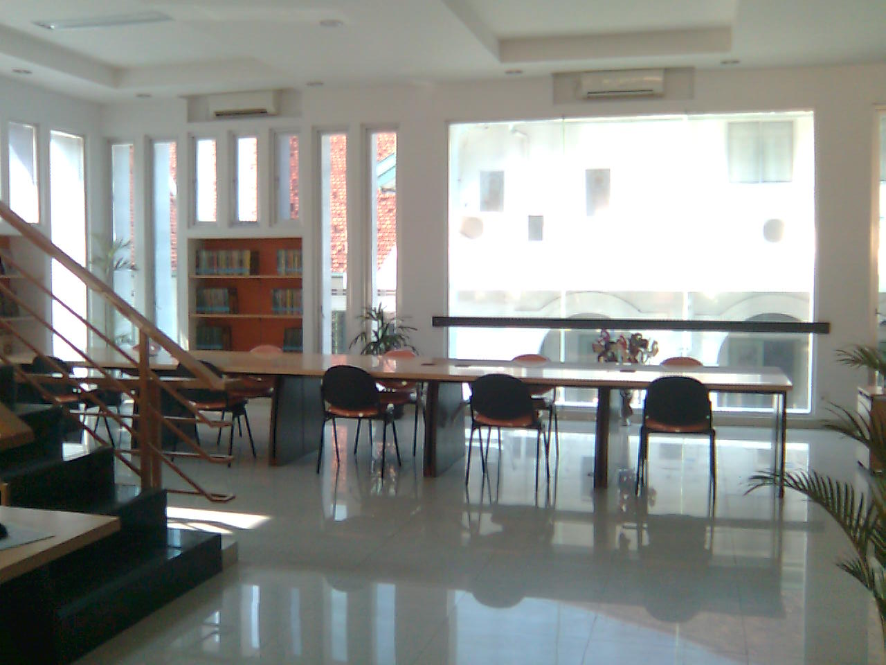 Di tiap lantai juga ada meja-meja panjang buat bikin tugas sepulang sekolah. Di lantai dua khususnya ada semacam kelas, isinya kursi lipat yang ada mejanya banyak, sama rak-rak buku juga. Di situ ada komputer sama LCD proyektor. Mungkin kalau persediaan di sekolah udah dibooking semua jadi ruangan itu bisa jadi alternatif.. Lantai 3 itu isinya buku-buku nonfiksi, ensiklopedia, kamus-kamus, dan lainnya deh biasanya buat cari tugas…juga ada year book, sama karya tulis para alumni. Di lantai 3 itu paling banyak sofa sama mejanya. Lantai 3 ini sangat PEWE buat bikin tugas kelompok pulang sekolah. Tinggal bawa laptop aja, sama adaptornya, di deket meja-meja ada colokan jadi enak buat laptop. Di perpustakaan tersedia wifi jadi tinggal beli voucher sama petugas perpustakaannya. (huhu ga gratis >.<) di lantai 3 ini juga ada WC sih jadi gausah ke wilayah sekolah buat pipis.