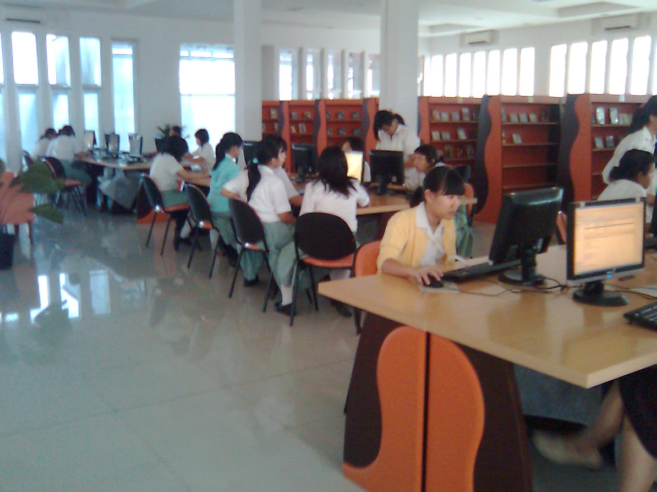 emang perpustakaan baru SMP dan SMA Santa Ursula Jakarta tahun ini resmi dibuka dan bisa diakses murid-murid, guru, staf, dan bahkan alumni SMP dan SMA Santa Ursula Jakarta. Perpustakaan ini adalah sebuah gedung terpisah dari gedung sekolah SMP dan SMA Santa Ursula Jakarta. Perpustakaan ini memang sangat-sangat kerenn! Meskipun sekolah gue berumur lebih dari seabad, persisnya tahun 2009 nanti 150tahun, tapi Sanur tetap up to date dengan perkembangan teknologi! Untuk hal ini salut deh. Ya seneng aja, ga sia-sia bayar mahal-mahal, karena jelas duitnya kemana dan gunanya pun sangat sangat terasa.