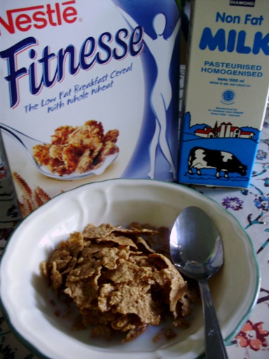Sarapan: karbohidrat (bukan nasi putih dan bukan roti putih), protein (putih telur), dan minuman tanpa gula (susu skim, teh atau kopi). Kalo gue jadinya sarapannya: susu skim dengan sereal Nestle Fitnesse (sereal rendah lemak dan whole grain) sama putih telur gue masak pake irisan cherry tomato dan rempah-rempah, dan minumnya..(pastinya bukan Teh Botol karena itu gulanya alamakjang banyaknya) teh hijau pahit. Kadang gue variasikan dengan roti gandum dioles dengan peanut butter (peanut butter masih dibolehin..selai-selai yang manis-manis gak boleh) dengan irisan apel dan ditabur kayu manis halus lalu dipanggang. Kalau di meja makan gue lagi ada sayur rebus biasanya gue santap juga sih hehe.