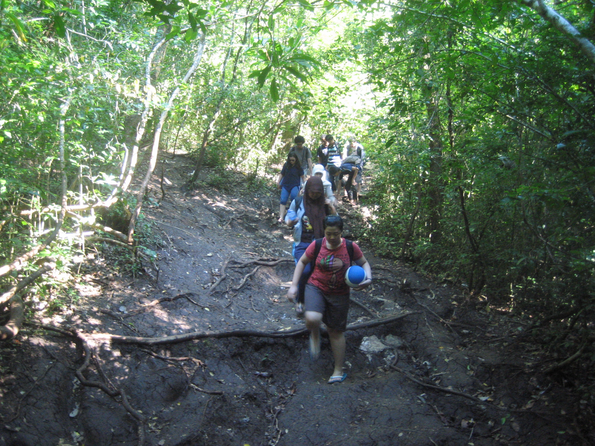 Oke jadi naik perahu itu cuma 1/8 dari total perjalanan menuju Segara Anakan. Sisanya adalah menembus hutan untuk mencapai pantai Segara Anakan! Medannya berlumpur, naik turun, gak ada infrastruktur sama sekali..jadi pegangan cuma mengandalkan akar pohon dan tangan temen! Di beberapa spot harus nunduk buat ngelewatin batang pohon yang udah jatoh, harus nyeberang kali kecil di jembatan kecil dari batang pohon yang cuma muat satu orang.. Gak kebayang sih kalau gak pake guide gimana karena rawan kesasar sih. Kata guide kita sih, di pulau itu ada 29 ekor macan. Eksotis banget yak. Sebenernya perjalanan ini bisa ditempuh 30 menit tapi kalau gak biasa hiking ya bakal lama. Apalagi kemaren entah kenapa kita semua lupa untuk nyewa sepatu jadi menembus medan kayak gitu pake sendal jepit. Makin-makin deh, belom lagi kalau sendal jepitnya basah susah banget! Untungnya pada saat itu tanah yang kita lewati cukup kering (gak hujan untungnya!) jadi sendal kita gak nyangkut-nyangkut. Sepanjang perjalanan ada beberapa sandal tertinggal, mungkin karena nyangkut kali yak. Itu udah super takut kalau sendal putus di tengah jalan, tapi untungnya sendal kita aman sentosa. Baju kita sampai basah oleh keringet. Belum lagi bawaan kita yang berat. Kan di Segara Anakan gak ada yang jual makanan dan air bersih, jadi kita bawa nasi, lauk, snack, dan air mineral. Oh di Sendang Biru kita juga beli bola (di foto di atas dipegang oleh Teteph haha), 8 ribu perak, biar di pantai ada mainan gitu.