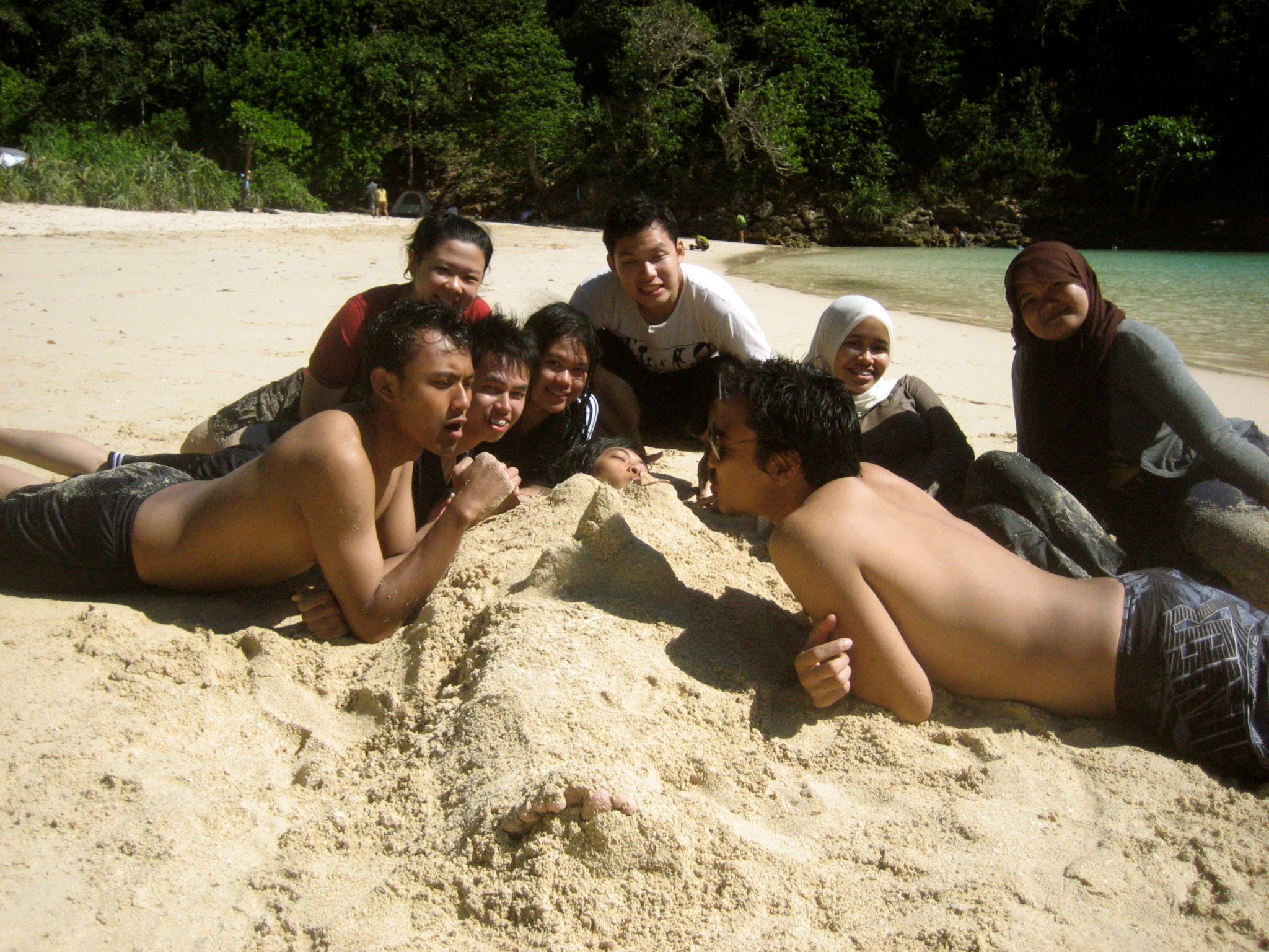 Udah siang dan capek abis trekking akhirnya langsung makan siang. Kelar makan siang, ganti baju, byuuuur main air. Siang bolong gitu matahari bersinar super terik jadi emang udah resiko bakal menghitam. Tapi demi main-main di Sempu, rasanya rela aja sih. Airnya seger banget dan dingin. Untung si Fareza beli bola jadi kita main-main bola, foto-foto, terus mengubur si Fareza dalam pasir. Serulah main-main di pantai bareng temen-temen gitu. Happy banget, ketawa-ketawa, pokoknya kalo gue inget semua orang bener-bener sumringah.
