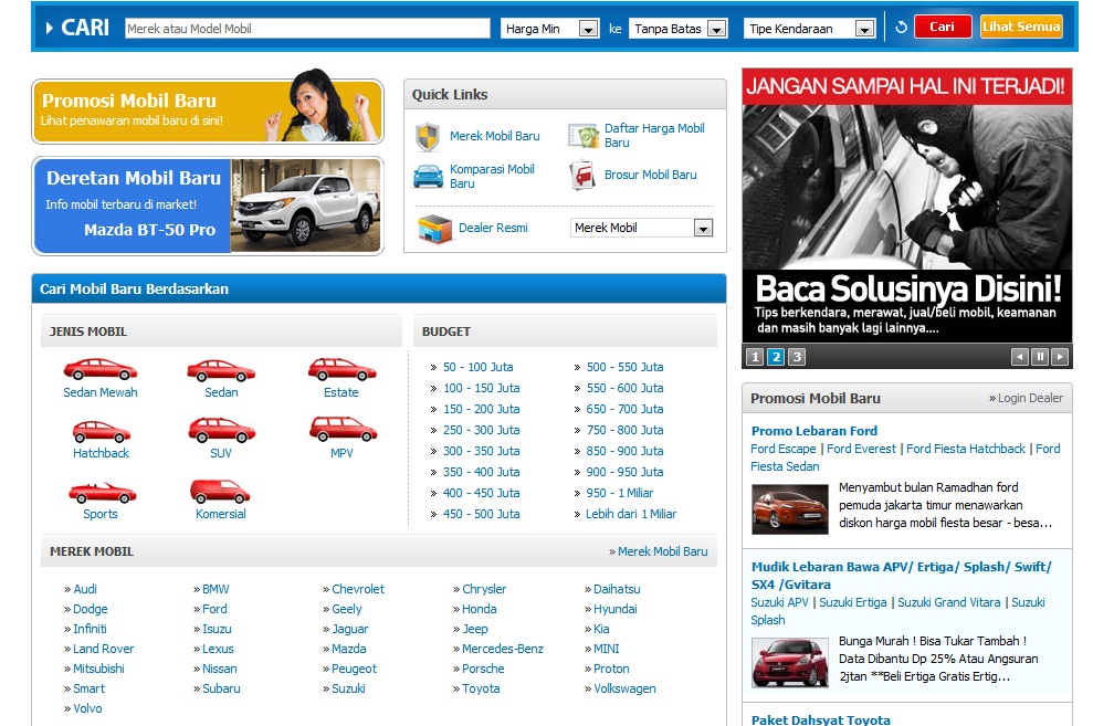 Dari segi: kelengkapan informasi, kemudahan akses, penyajian yang sistematis dan rapi, ter-update-nya informasi, CarMall.com bisa dibilang menjadi ensiklopedia yang komprehensif, praktis, dan terpercaya seputar cari mobil baru dan merawat mobil buat kamu yang mau beli mobil baru, butuh jasa seputar mobil atau asesoris/maintennance, atau sekadar gemar otomotif. CarMall.com terlihat mengerti apa yang diinginkan dan dibutuhkan pembeli mobil baru. CarMall.com memberikan pelayanan akses informasi yang nyaman, tanpa iklan yang terlalu ramai dan mencolok atau pop up yang menyebalkan. Soal keamanan dapat dipercaya karena CarMall.com bekerja sama dengan dealer resmi, bengkel resmi, dan jasa finansial/asuransi resmi untuk otomotif. Jadi, jangan ragu untuk mengakses CarMall.com: portal otomotif yang praktis dan dapat diandalkan. CarMall.com: jelas terdepan untuk cari mobil baru.