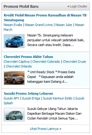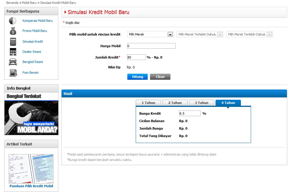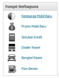Di sisi kiri CarMall.com terdapat kotak Fungsi Serbaguna seperti gambar di bawah. Memang sesuai namanya ya, serbaguna. Dengan mudah kamu bisa melakukan komparasi mobil baru, tau promo terkini, simulasi kredit dan tau dealer resmi, bengkel resmi, dan pom bensin! Cerdik banget ya.