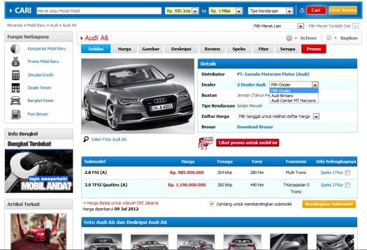Di setiap tipe mobil informasi yang disediakan sangat lengkap mulai dari: dealer resmi (bisa pilih yang dekat area kamu), daftar harga (yang diupdate terus jadi kamu bisa pilih tanggal terbaru),pilihan submodel, harga, foto, dan review. Penyajian semuanya sistematis dan lugas sehingga info yang penting bisa langsung terbaca dengan jelas. Gue terkesan dengan pilihan daftar harga yang bisa dipilih tanggalnya bisa pilih yang sudah lama atau yang terbaru. Dengan begitu, selain tau harga terbaru mobil yang kita inginkan, kita juga bisa tau fluktuasi perubahan harga terhadap waktu. Salah satu faktor yang bikin gue enggan belanja online adalah harga yang kadang kala udah basi..untungnya Carmall.com tampak rajin melakukan update harga. Contohnya pas gue pilih harga Audi A6 yang terbaru (Juli 2012), langsung terbuka deh file pdf hasil scan brosur harga langsung dealer. Super convenient! Hemat energi dan hemat waktu kan daripada mondar mandir ke dealer buat tau info lengkap harga terbaru. Belum lagi kalau macet..hadeuh.