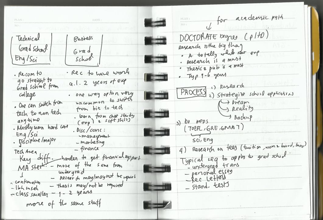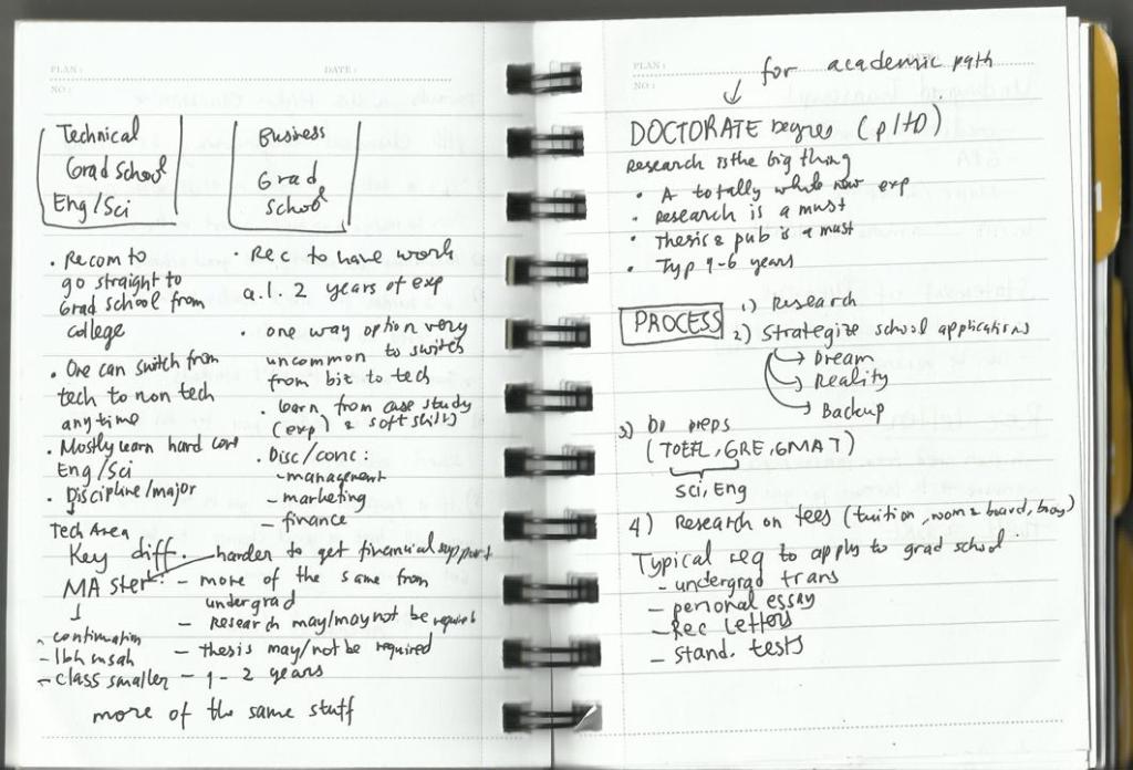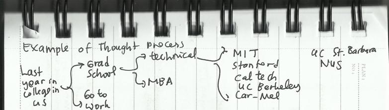 Pak Willy menganjurkan kita untuk membuat Thought Process. Bentuknya bagan yang isinya opsi-opsi untuk masa depan. Ini gue lampirkan hasil scan catatan gue tentang Thought Process milik Pak Willy sendiri saat beliau di persimpangan jalan. (Yeah silly me, I didn’t take a picture of it with my phone. Sorry for the bad handwriting.)