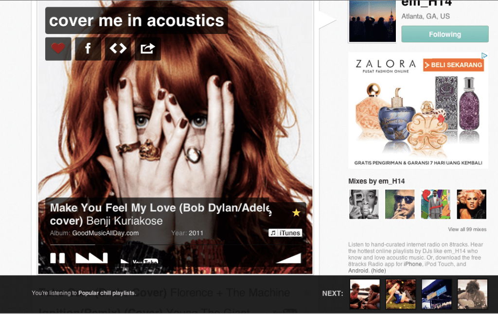 8tracks adalah situs streaming musik. Gratis dan modal suasana hati dan koneksi internet memadai, kamu bisa mencari-cari playlist yang sesuai suasana hati kamu. Yang lucu kamu tinggal ketik di kotak Search pengen musik kayak apa. Misalnya: rain, sad, happy, acoustic, study, relax, sleep, soul, jazz. Dan search kamu bisa dikerucutkan lagi kalau kamu tambah lagi kriterianya. Jadi bisa: soul + relax + chill. Asik banget! Gak bisa didownload (gak legal bro! Haha). Beberapa playlist favorite gue: The Quiet Noise, Male Voices That’ll Make You Melt, Breakfast in Paris, Waking Up With Your Love Next To You….dan masih banyak! Oh iya yang gue suka dari 8tracks lagi adalah judul playlistnya lucu-lucu. Yang asik dari 8tracks adalah bikin wawasan musik lo bertambah karena banyak lagu-lagu yang gak terlalu mainstream tapi enak di dalam playlist-playlistnya. Beda bangetlah dengan mendengar radio lokal yang muter ‘hits’ tapi diulang-ulang melulu kayak kaset rusak.