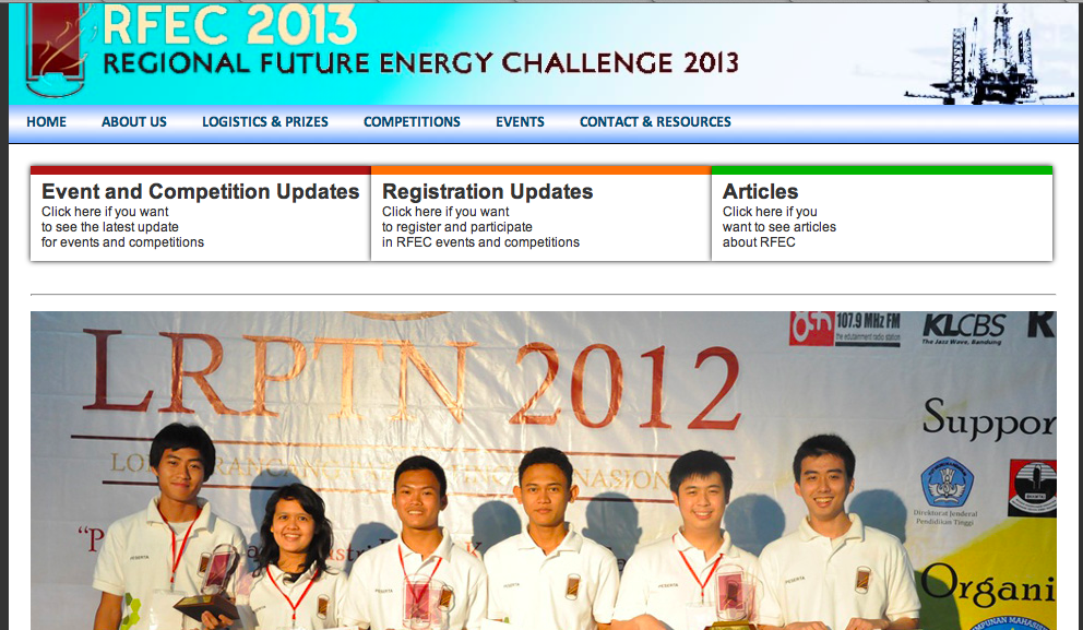 Regional Future Energy Challenge 2013 adalah event besar mendatang yang dibawa oleh mahasiswa teknik kimia ITB. Gue termasuk di dalam panitianya, yaitu menjadi kepala divisi Acara alias head of programs division. You can imagine the responsibility on my shoulders, but trust me I’m enjoying every minute of it. Gue emang suka sih meng-arrange acara dan bekerja di kepanitiaan. Kepanitiaan kali ini terasa exciting! Karena setelah 13 tahun berjalan, Lomba Rancang Pabrik Tingkat Nasional kini berevolusi menjadi event regional Asia Tenggara dan sekitarnya yang berjudul Regional Future Energy Challenge 2013 alias RFEC 2013. Buat anak teknik kimia, bisa ikut Plant Design Competition (lomba rancang pabrik, mungkin yang bisa ikut anak tingkat 4 karena materi rancang pabrik baru diberikan di tingkat 4) dan Problem Solving Competition (lomba memecahkan masalah riil di pabrik. di LRPTN 2012 pabrik yang menyumbang persoalan adalah PT Krakatau Steel. Kategori ini memang menantang! Kamu ditantang buat mengaplikasikan ilmu yang didapet di kelas, secara komprehensif pula, buat mecahin soal riil. Waktu itu gue jadi LO juri dari PT KS dan setelah bercakap-cakap, masalah yang disumbang memang persoalan beneran dan emang dalm tahap penyelesaian. Oh iya di kategori Problem Solving ini gak sekedar menuliskan jawaban dalam laporan tapi di Grand Final bakal dipresentasikan dan debat dengan finalis lain. Super seruuuuu! Buat ikut lomba ini kamu nggak harus tingkat 4 kok, buktinya di LRPTN 2012 pemenangnya temen seangkatan gue yang tingkat 3.) Nah di RFEC 2013 ini ada lomba yang bisa diikutin anak-anak non-tekim! Poster competition! Bikin poster infographic menarik bertema Energy Mix of The Future! Lomba ini dibuka buat anak-anak di luar jurusan tekim karena isu energy mix ini perlu pemahaman dari berbagai segi karena dalam pemecahannya pun menuntut kerjasama multidisiplin bukan? Sooo siap-siap dan ikutin aja di websitenya ya 🙂
