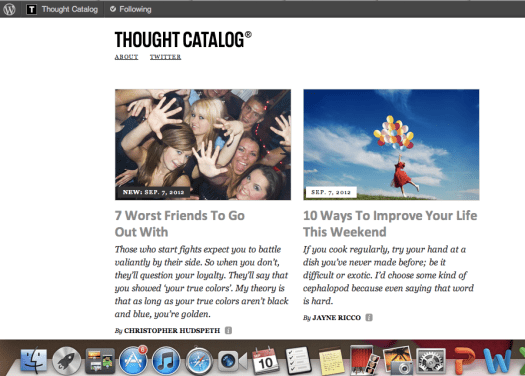 Thought Catalog berisi essay pendek tentang topik-topik random. Ada yang galau, ada yang tentang sex, ada yang tentang sayuran, gila campur aduk nano-nano. Gue sih suka yang galau-galau asmara, atau galau kehidupan twenty-something. Gak jarang gue menemukan artikel yang setiap katanya pas banget dengan apa yang gue pikirkan, rasakan atau alami. Kacau memang. Gaya bahasanya asik buat dibaca, menggelitik, dan terkadang kontroversial but most of the time….very true. Banyak juga post yang berbagi tips dan pengalaman yang gak pasaran atau general seperti di website self help atau majalah. Tips dan pengalaman aneh-aneh, very personal (karena berangkat dari pengalaman pribadi), but makes a lot of sense.