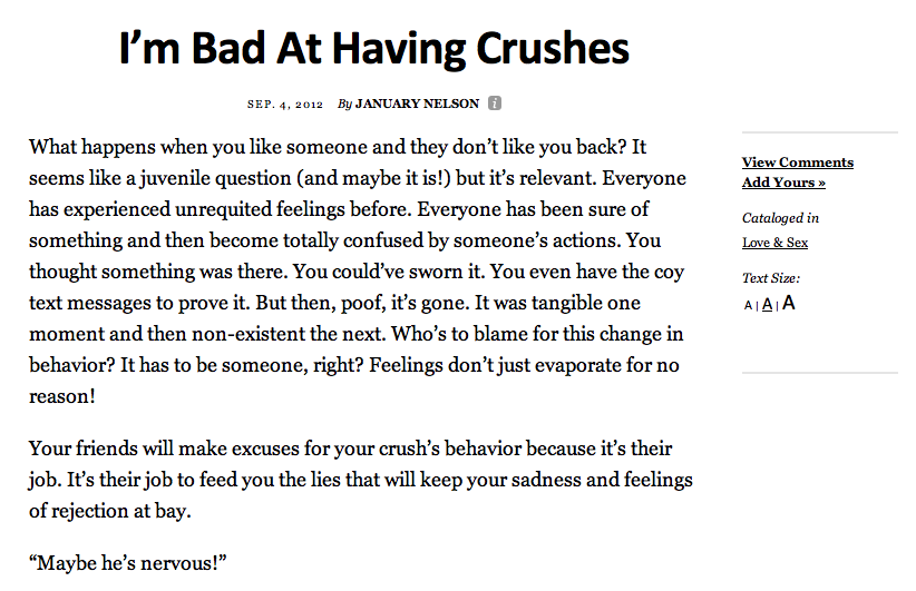 Salah satu artikel favorit gue di Thought Catalog berjudul I’m Bad at Having Crushes oleh January Nelson. Bagus banget dan pas banget..it totally fits my emotions and experiences.