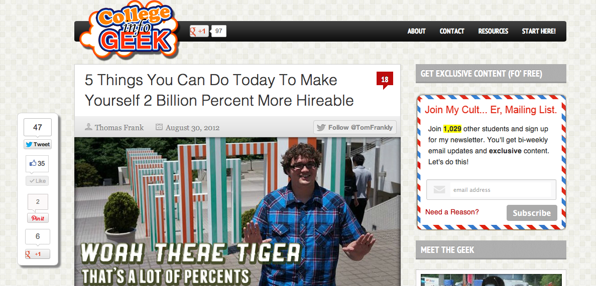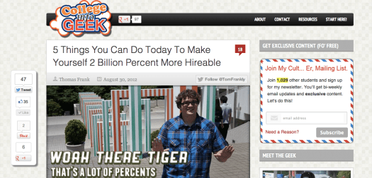 Website ini berisi artikel-artikel yang bagus buat mahasiswa-mahasiswa yang gemar teknologi, pengen meningkatkan produktivitas, dan lagi ancang-ancang menuju kehidupan profesional. Gaya menulisnya asik, komprehensif, dan enak banget dibaca. Judulnya aja catchy kan (lihat foto printscreen di atas). Artikelnya beragam dari tips interview, tips bikin CV, tips magang, buku yang wajib dibaca mahasiswa, website streaming musik…serba serbi kehidupan mahasiswa deh 😉 Must read banget!
