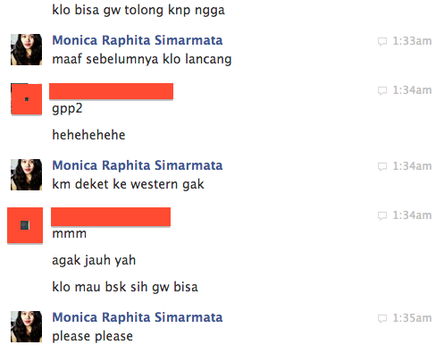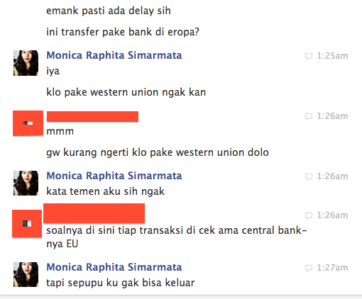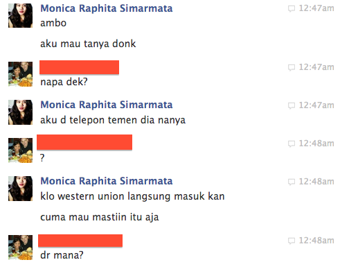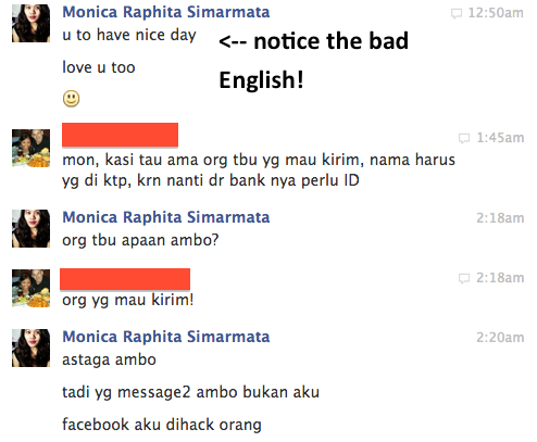 Si Hacker bangsat ini ngechat 3 orang (at least itu yang ketauan, kalo ada chat lagi, mungkin udah dia hapus): 1 Facebook friend yang gak gitu kenal, 1 sahabat gue yang tinggal di Amerika, dan 1 tante gue yang tinggal di Amerika. Dari pola orang-orang yang dia Chat-in, target dari penipuan ini adalah Facebook friend gue yang tinggal di luar negeri dan diminta transfer uang via Western Union.