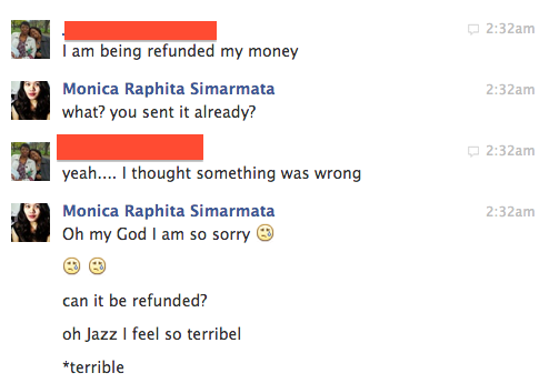 Sayangnya, rekaman chat sama sahabat gue dihapus sama si Hacker bangsat. Victim 3, sahabat gue, sudah mentransfer uangnya dengan nominal 625 USD tapi Thank God, berhasil direfund.