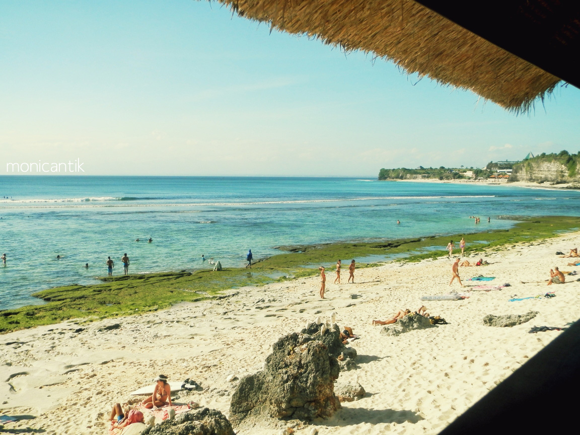 Bingin, is probably my favorite of the 4. It’s located next to Dreamland, the more hip and upscale version. It was really cool that we reached it through narrow alleys going through inns and bed&breakfasts. What was cool was, we parked near a field of cows (and cow dung) and there was no beach in sight. Had I not knew that my friend was leading me to a beach I would not have known that we were heading to a beach. She says that’s why it’s also called Impossible. From the way you get there and the surroundings before reaching the beach, it’s kinda impossible that there actually is a beach down there. The alleys were steep. The white walls had vines growing on them. It kind of reminded me of Santorini somehow. The view from above (the upper picture) is fantastic. You can also see Dreamland and its hip spots in the far right. Bingin has plenty of inns where you can stay and have a view of the beach right from your window. There are also some cool cafes that are super laid back that aren’t as upscale as the ones you see in Dreamland (not the Potato Head type). The photo above was taken when we had sandwiches in one of the cafes (oh and this cafe served pork bacon. hahaha) What I love about this beach is the colors! The blue ocean, the green on the rocks, and the beige of the sand is so pretty. This one is great for swimming and playing. There were plenty of families there playing on the beach. I would really like to spend a night or 2 here.