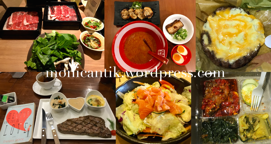 Kalau makanan Indonesia/Asia, pilih aja lauk yang gak digoreng tepung, gak pakai kecap/gula/gula merah. Misalnya, ayam goreng, bebek goreng, telur ceplok, tongseng tanpa kecap, soto betawi (bukan yang pakai susu), sop buntut, sop iga. Gue sih gak suka jeroan/tetelan/otak/kikil/daging yang aneh-aneh gitu, tapi ada yang memilih makanan tipe itu sebagai sumber lemak. Kalau makan di restoran bertema Western, bisa pilih steak (tapi jangan dikasih saos barbecue/saos tomat), burger tanpa roti (kalau di Carl’s Jr bisa versi low carb, rotinya diganti daon selada, kalau di Burger King bisa tanpa roti, nanti burgernya dimasukin ke kotak kertas dan jadinya keliatan dikit banget haha), salad tanpa crouton (hati-hati dengan dressingnya, kalau minyak/keju-kejuan sih gapapa). Atau kalau mentok gak bisa makan apa-apa, ya gue sih minum teh tanpa gula atau jus alpukat murni (tanpa gula, tanpa susu). The thing about makan di luar ketika lo udah memilih lifestyle keto adalah: pengeluaran bertambah mahal. Lah kan gak makan nasi? Yup justru karena itu. Kadang kalau gue lagi laper, kalau lagi makan di luar gak cukup pesan 1 menu. Jadinya malah pesan 2 porsi atau 2 menu beda, atau 1 menu main course sama 1 appetizer dan itu buat gue sendiri! Another thing about eating out is: watch out for hidden carbs, karbohidrat yang tersembunyi entah di bumbu jadi atau saos-saosan.