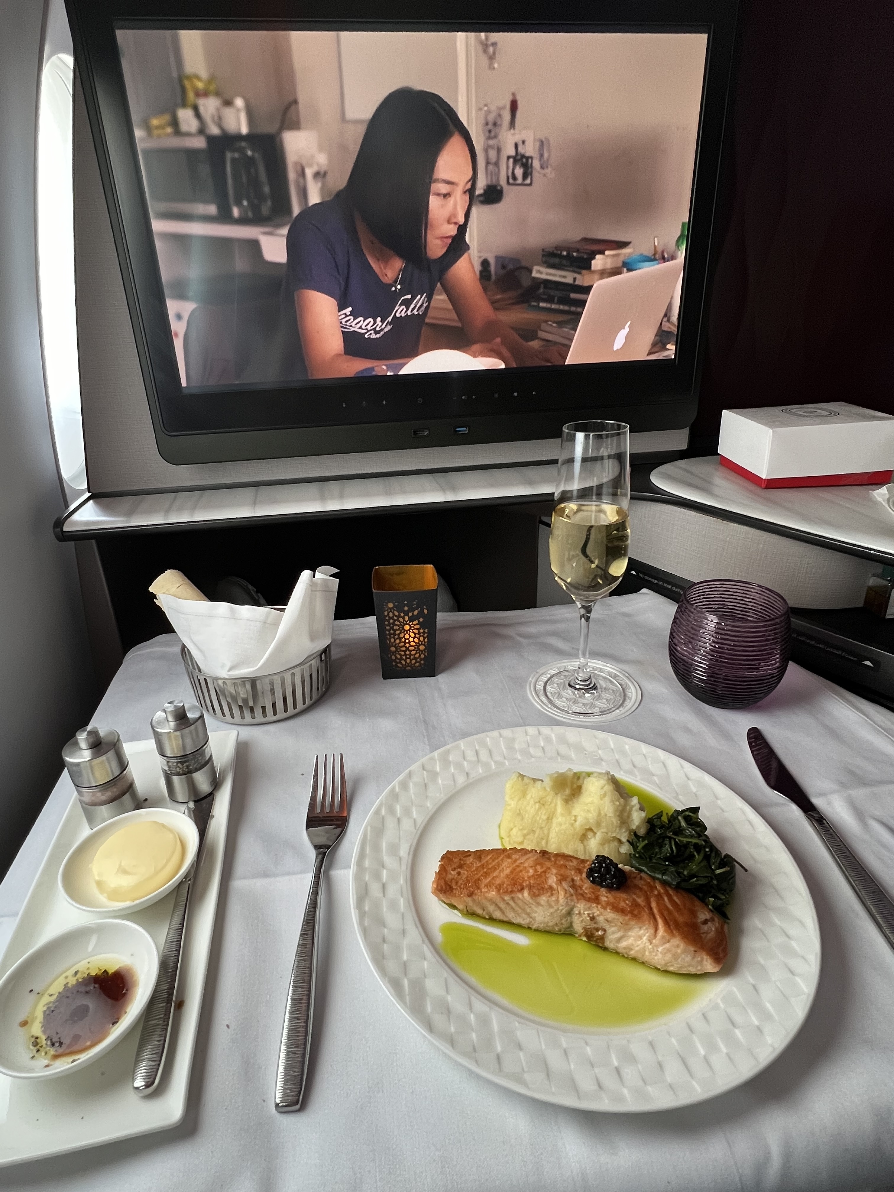 - Food: Makanan di business class Qatar itu ENAK dan banyak pilihan. So far favorite gue adalah lobster – enak banget! Salmonnya juga enak. Gue suka banget roti dan olive oil yang dihidangin sebelum main course. Pilihan champagne-nya juga oke.